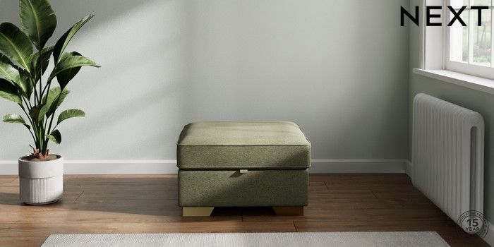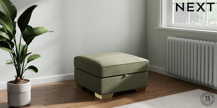 7.2.10 Stamford Buttoned Back Storage Footstool Tweedy Chenille Mid Moss Green Square Angle - Brushed Brass | Made Click here to use our website with more accessibility support, for example screen readers