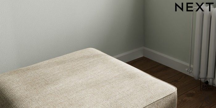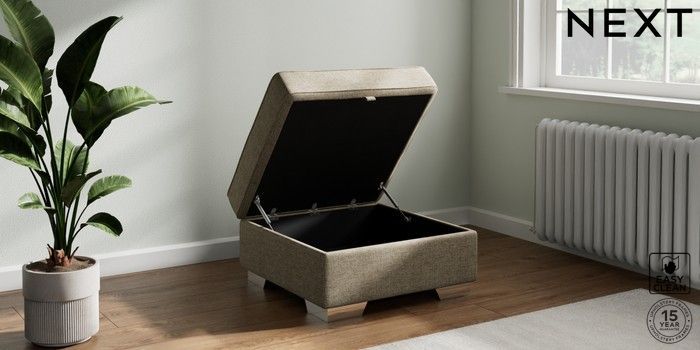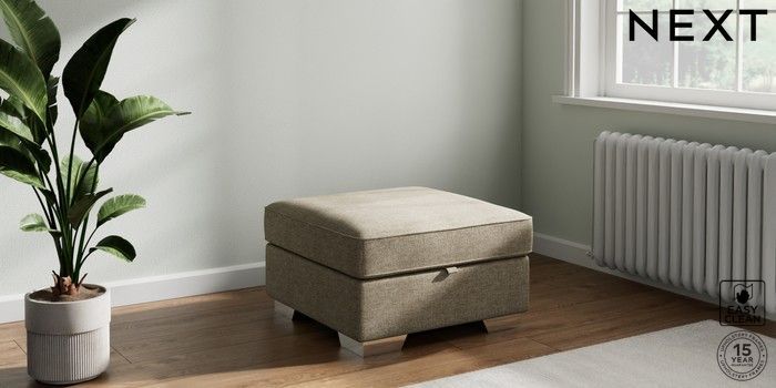 7.2.10 Stamford Buttoned Back Storage Footstool Woven Chenille Easy Clean Mid Natural Square Angle - Chrome Metal | Made Click here to use our website with more accessibility support, for example screen readers
