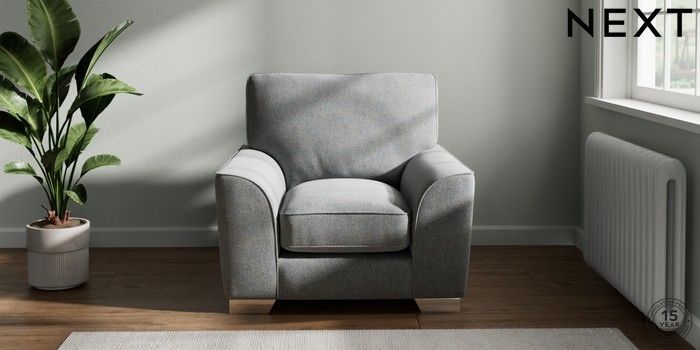 7.2.10 Stamford Grand Relaxed Sit Armchair Chunky Marl Mid Grey Square Angle - Chrome Metal | Made Click here to use our website with more accessibility support, for example screen readers