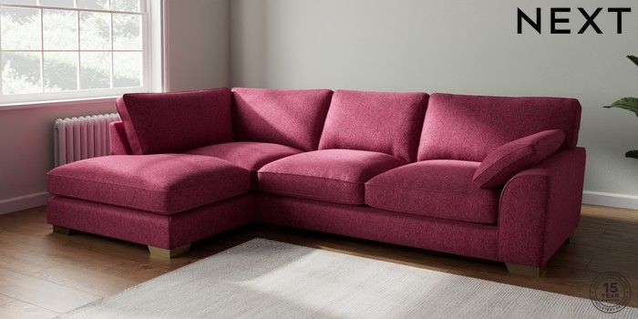 7.2.10 Stamford Grand Relaxed Sit Large Corner Chaise - Left Hand Cotswold Chenille Dark Raspberry Pink Large Square Angle - Brushed Brass | Made Click here to use our website with more accessibility support, for example screen readers