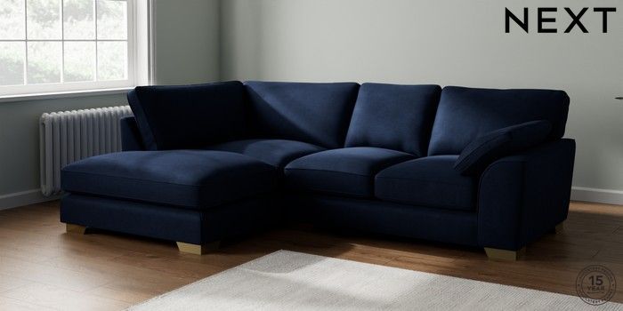 7.2.10 Stamford Grand Relaxed Sit Medium Corner Chaise - Left Hand Luxe Chenille Navy Blue Large Square Angle - Brushed Brass | Made Click here to use our website with more accessibility support, for example screen readers