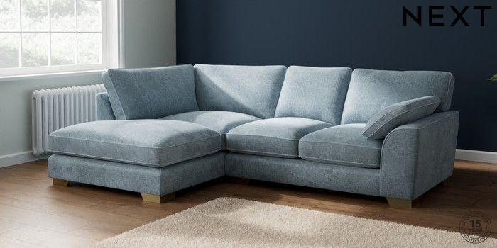 7.2.10 Stamford Grand Relaxed Sit Medium Corner Chaise - Left Hand Plush Chenille Light Blue Large Square Angle - Brushed Brass | Made Click here to use our website with more accessibility support, for example screen readers