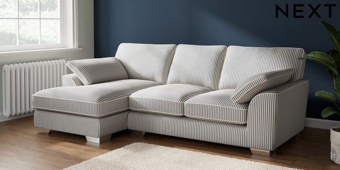 7.2.10 Stamford Grand Relaxed Sit Medium Sofa Chaise - Left Hand Chenille Stripe Slate Blue Large Square Angle - Chrome Metal | Made Click here to use our website with more accessibility support, for example screen readers