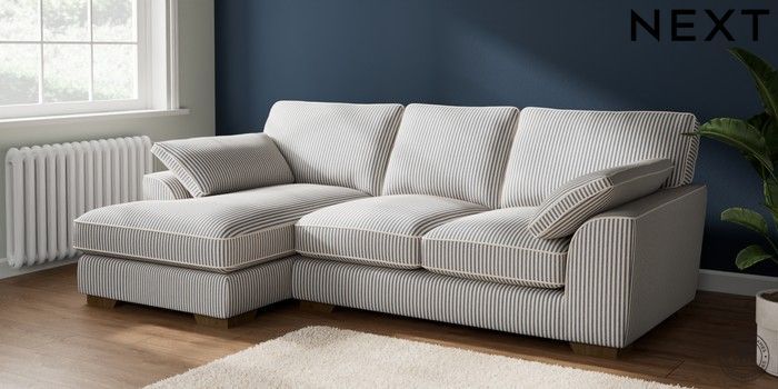 7.2.10 Stamford Grand Relaxed Sit Medium Sofa Chaise - Left Hand Chenille Stripe Slate Blue Large Square Angle - Mid | Made Click here to use our website with more accessibility support, for example screen readers