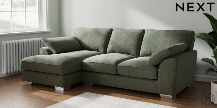 7.2.10 Stamford Grand Relaxed Sit Medium Sofa Chaise - Left Hand Chunky Texture Mid Forest Green Large Square Angle - Chrome Metal | Made Click here to use our website with more accessibility support, for example screen readers