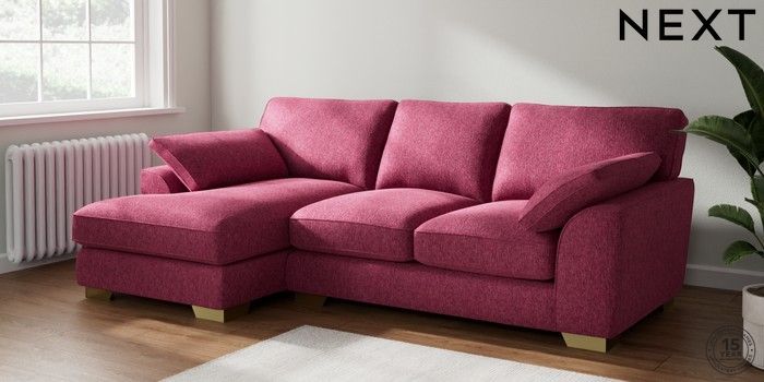 7.2.10 Stamford Grand Relaxed Sit Medium Sofa Chaise - Left Hand Cotswold Chenille Dark Raspberry Pink Large Square Angle - Brushed Brass | Made Click here to use our website with more accessibility support, for example screen readers