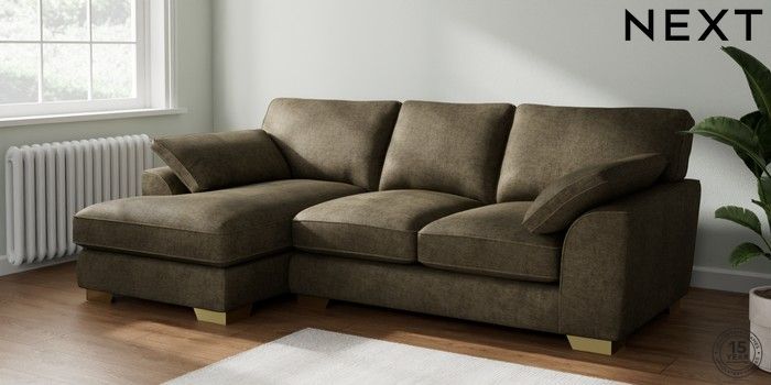 7.2.10 Stamford Grand Relaxed Sit Medium Sofa Chaise - Left Hand Plush Chenille Moss Green Large Square Angle - Brushed Brass | Made Click here to use our website with more accessibility support, for example screen readers