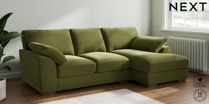 7.2.10 Stamford Grand Relaxed Sit Medium Sofa Chaise - Right Hand Plush Velvet Easy Clean Mid Olive Green Large Square Angle - Mid | Made Click here to use our website with more accessibility support, for example screen readers