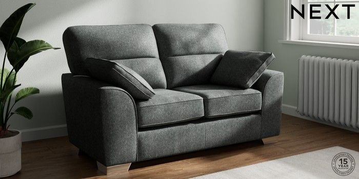 7.2.10 Stamford Highback 2 Seater Small Sofa Cotswold Chenille Dark Grey Large Square Angle - Chrome Metal | Made Click here to use our website with more accessibility support, for example screen readers