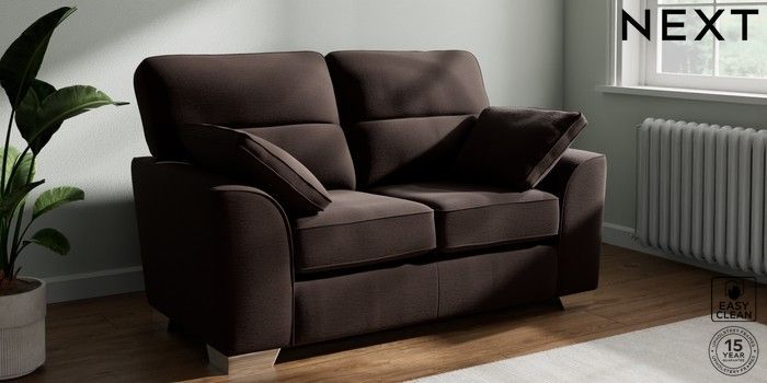 7.2.10 Stamford Highback 2 Seater Small Sofa Fine Chenille Easy Clean Chocolate Brown Large Square Angle - Chrome Metal | Made Click here to use our website with more accessibility support, for example screen readers