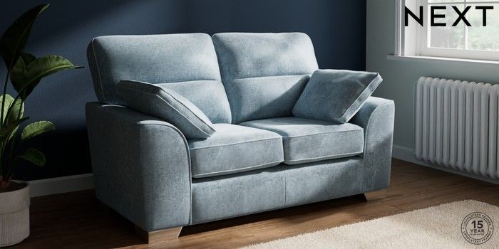 7.2.10 Stamford Highback 2 Seater Small Sofa Plush Chenille Light Blue Large Square Angle - Chrome Metal | Made Click here to use our website with more accessibility support, for example screen readers