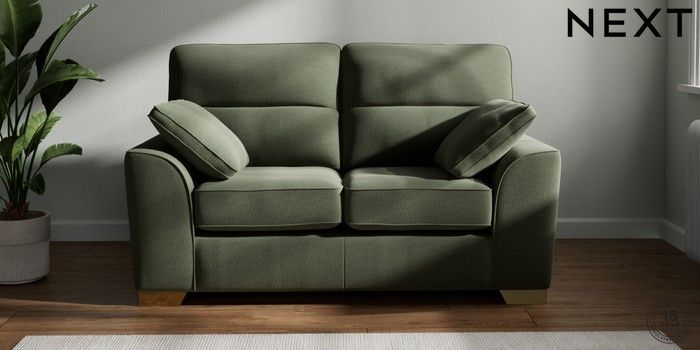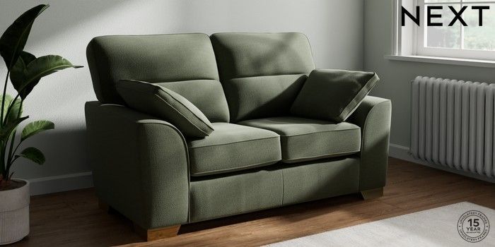 7.2.10 Stamford Highback 2 Seater Small Sofa Relaxed Linen Look Dark Green Large Square Angle - Brushed Brass | Made Click here to use our website with more accessibility support, for example screen readers