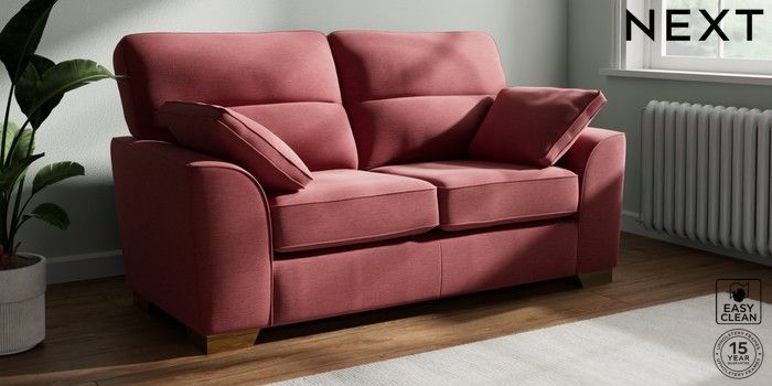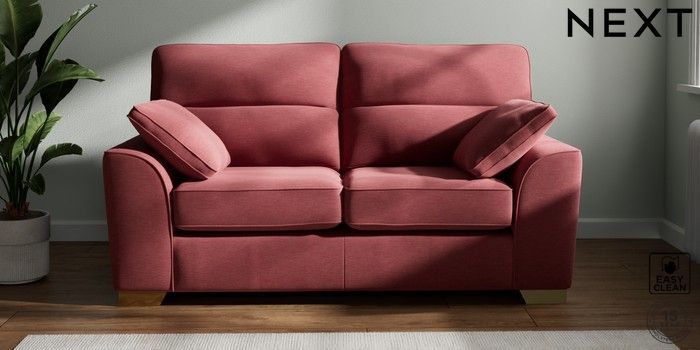 7.2.10 Stamford Highback 2 Seater Sofa Fine Chenille Easy Clean Mid Pink Large Square Angle - Brushed Brass | Made Click here to use our website with more accessibility support, for example screen readers