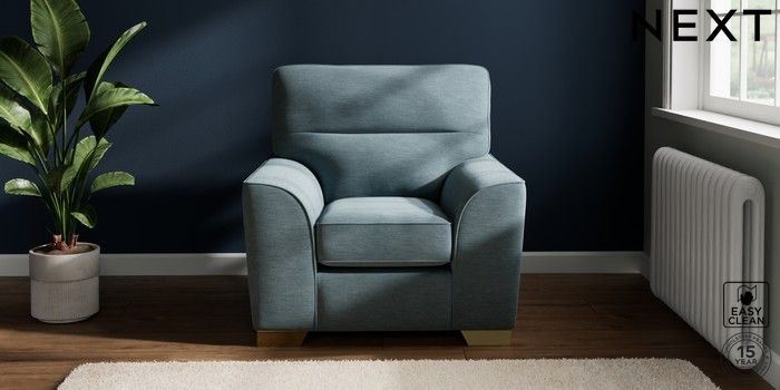 7.2.10 Stamford Highback Armchair Fine Chenille Easy Clean Mid Blue Square Angle - Brushed Brass | Made Click here to use our website with more accessibility support, for example screen readers