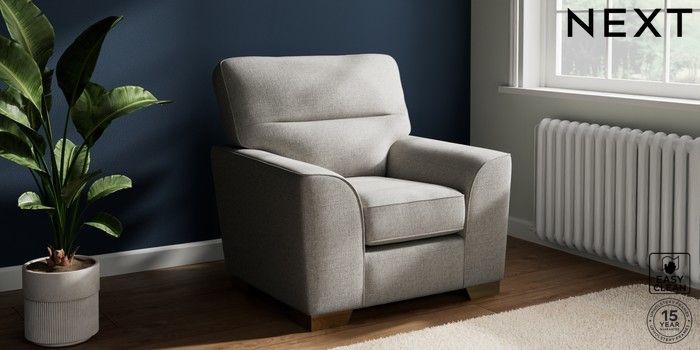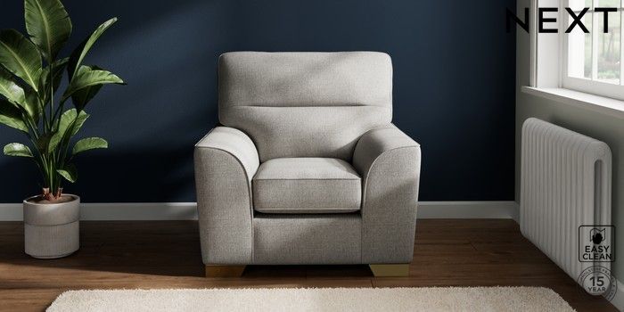 7.2.10 Stamford Highback Armchair Woven Chenille Easy Clean Light Grey Square Angle - Brushed Brass | Made Click here to use our website with more accessibility support, for example screen readers