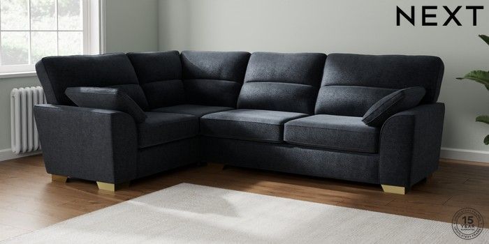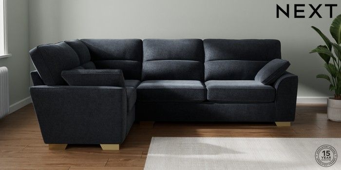 7.2.10 Stamford Highback Large Corner Sofa - Left Hand Boucle Chenille Dark Slate Blue Large Square Angle - Brushed Brass | Made Click here to use our website with more accessibility support, for example screen readers