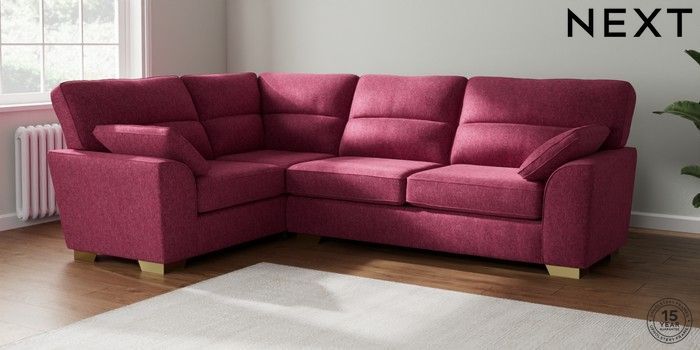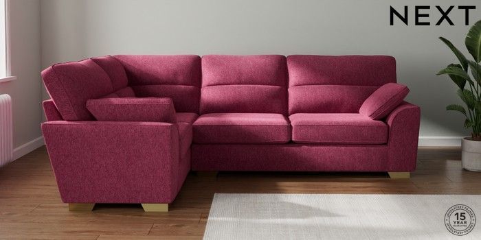 7.2.10 Stamford Highback Large Corner Sofa - Left Hand Cotswold Chenille Dark Raspberry Pink Large Square Angle - Brushed Brass | Made Click here to use our website with more accessibility support, for example screen readers