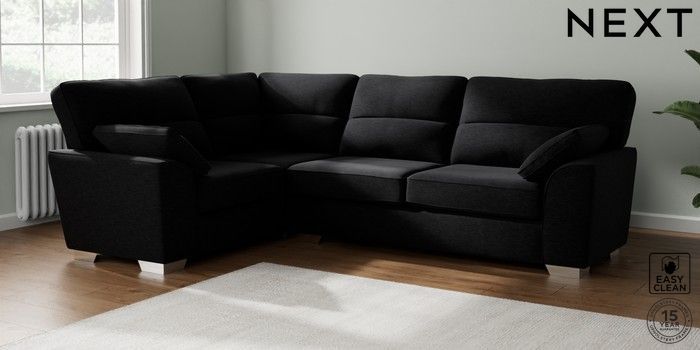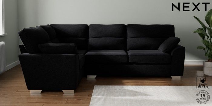 7.2.10 Stamford Highback Large Corner Sofa - Left Hand Fine Chenille Easy Clean Black Large Square Angle - Chrome Metal | Made Click here to use our website with more accessibility support, for example screen readers