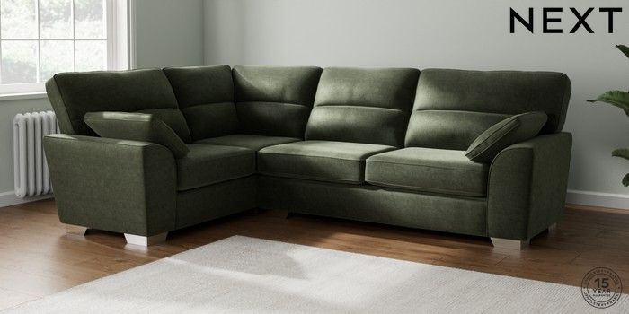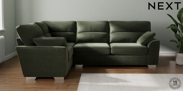 7.2.10 Stamford Highback Large Corner Sofa - Left Hand Luxe Chenille Mid Green Large Square Angle - Chrome Metal | Made Click here to use our website with more accessibility support, for example screen readers