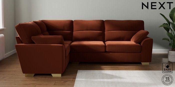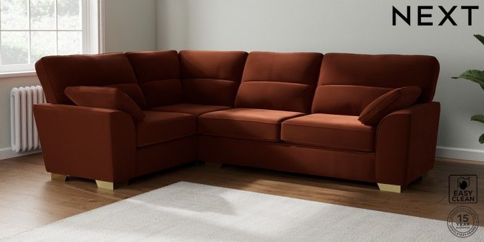 7.2.10 Stamford Highback Large Corner Sofa - Left Hand Plush Velvet Easy Clean Ginger Orange Large Square Angle - Brushed Brass | Made Click here to use our website with more accessibility support, for example screen readers