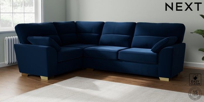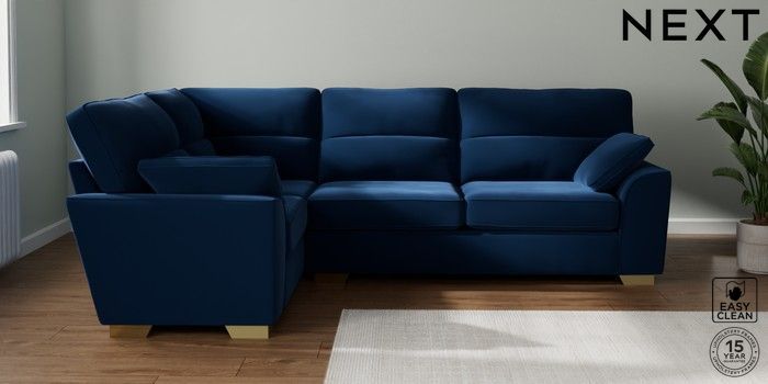7.2.10 Stamford Highback Large Corner Sofa - Left Hand Plush Velvet Easy Clean Navy Blue Large Square Angle - Brushed Brass | Made Click here to use our website with more accessibility support, for example screen readers