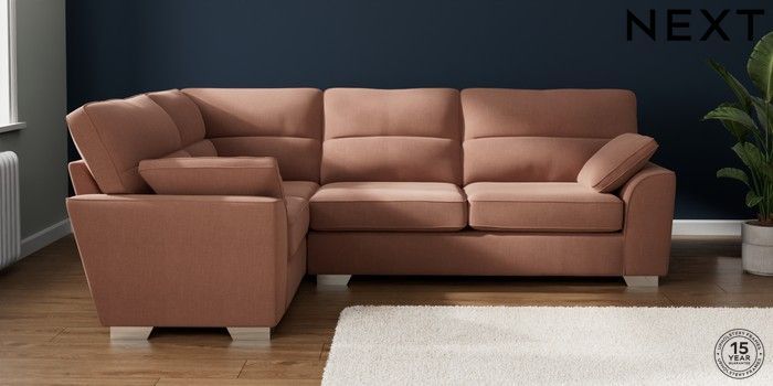7.2.10 Stamford Highback Large Corner Sofa - Left Hand Relaxed Linen Look Light Rust Brown Large Square Angle - Chrome Metal | Made Click here to use our website with more accessibility support, for example screen readers