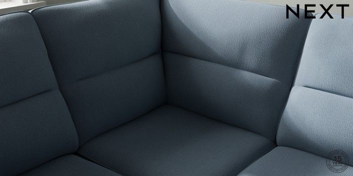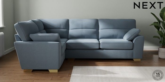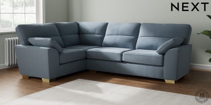 7.2.10 Stamford Highback Large Corner Sofa - Left Hand Relaxed Linen Look Mid Blue Large Square Angle - Brushed Brass | Made Click here to use our website with more accessibility support, for example screen readers