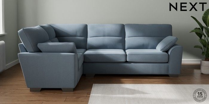 7.2.10 Stamford Highback Large Corner Sofa - Left Hand Relaxed Linen Look Mid Blue Large Square Angle - Gunmetal | Made Click here to use our website with more accessibility support, for example screen readers