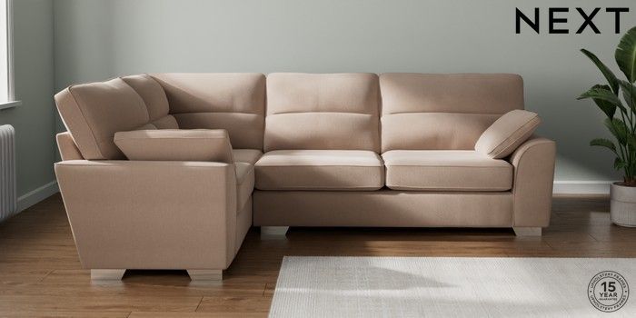 7.2.10 Stamford Highback Large Corner Sofa - Left Hand Relaxed Linen Look Mid Natural Large Square Angle - Chrome Metal | Made Click here to use our website with more accessibility support, for example screen readers