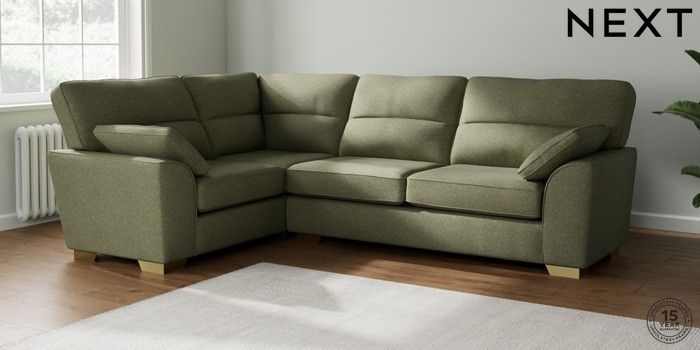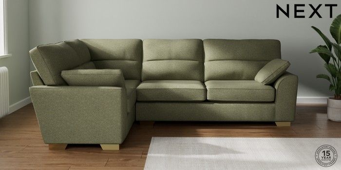 7.2.10 Stamford Highback Large Corner Sofa - Left Hand Tweedy Chenille Mid Moss Green Large Square Angle - Brushed Brass | Made Click here to use our website with more accessibility support, for example screen readers