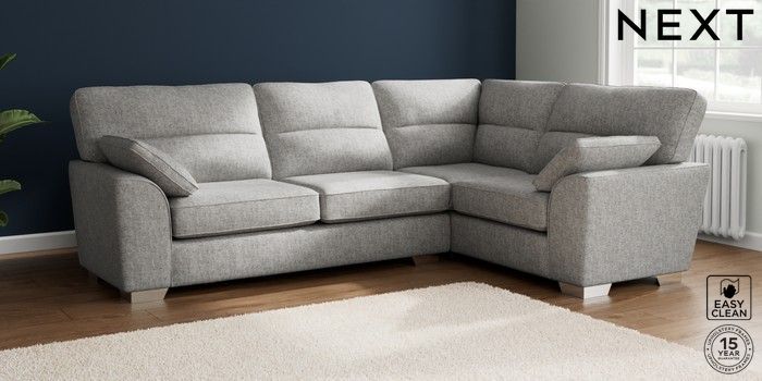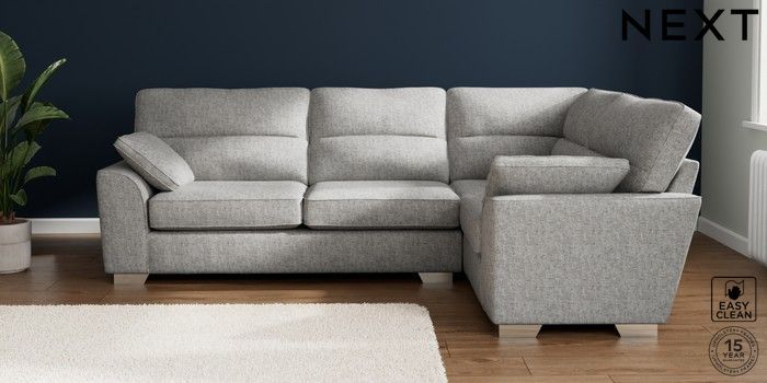 7.2.10 Stamford Highback Large Corner Sofa - Right Hand Chunky Boucle Easy Clean Light Grey Large Square Angle - Chrome Metal | Made Click here to use our website with more accessibility support, for example screen readers
