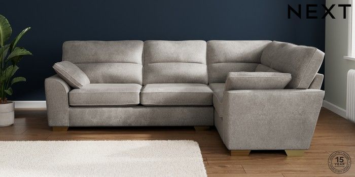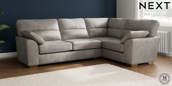 7.2.10 Stamford Highback Large Corner Sofa - Right Hand Plush Chenille Light Grey Large Square Angle - Brushed Brass | Made Click here to use our website with more accessibility support, for example screen readers