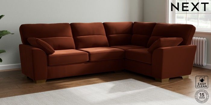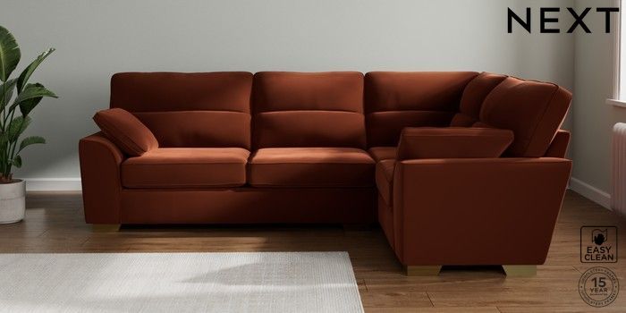 7.2.10 Stamford Highback Large Corner Sofa - Right Hand Plush Velvet Easy Clean Ginger Orange Large Square Angle - Brushed Brass | Made Click here to use our website with more accessibility support, for example screen readers
