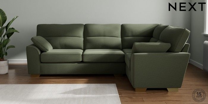 7.2.10 Stamford Highback Large Corner Sofa - Right Hand Relaxed Linen Look Dark Green Large Square Angle - Brushed Brass | Made Click here to use our website with more accessibility support, for example screen readers