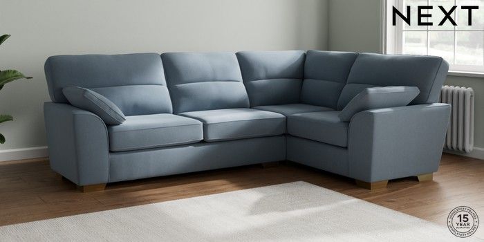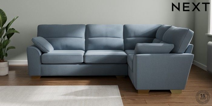 7.2.10 Stamford Highback Large Corner Sofa - Right Hand Relaxed Linen Look Mid Blue Large Square Angle - Brushed Brass | Made Click here to use our website with more accessibility support, for example screen readers