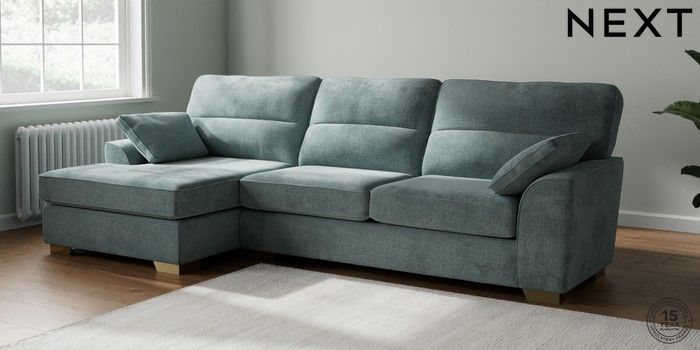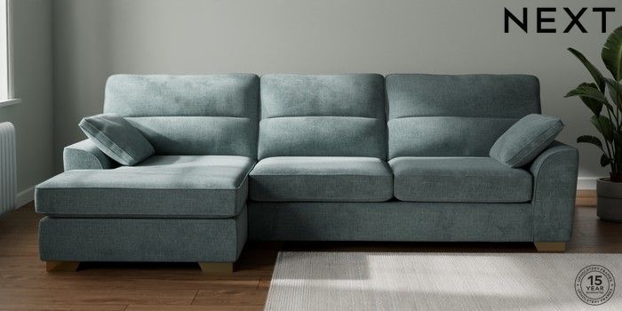7.2.10 Stamford Highback Large Sofa Chaise - Left Hand Chunky Chenille Light Teal Green Large Square Angle - Brushed Brass | Made Click here to use our website with more accessibility support, for example screen readers