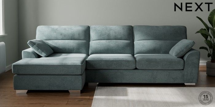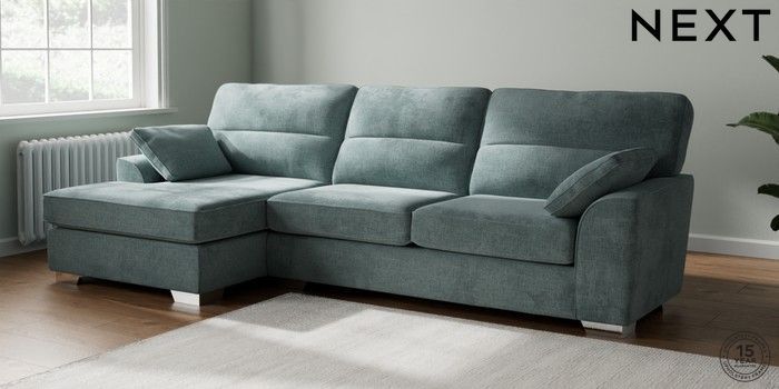 7.2.10 Stamford Highback Large Sofa Chaise - Left Hand Chunky Chenille Light Teal Green Large Square Angle - Chrome Metal | Made Click here to use our website with more accessibility support, for example screen readers