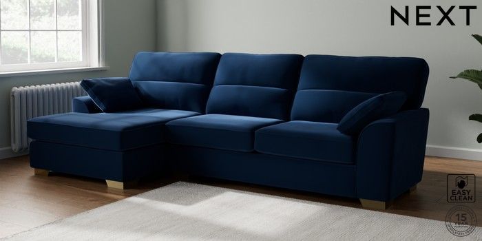 7.2.10 Stamford Highback Large Sofa Chaise - Left Hand Plush Velvet Easy Clean Navy Blue Large Square Angle - Brushed Brass | Made Click here to use our website with more accessibility support, for example screen readers