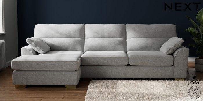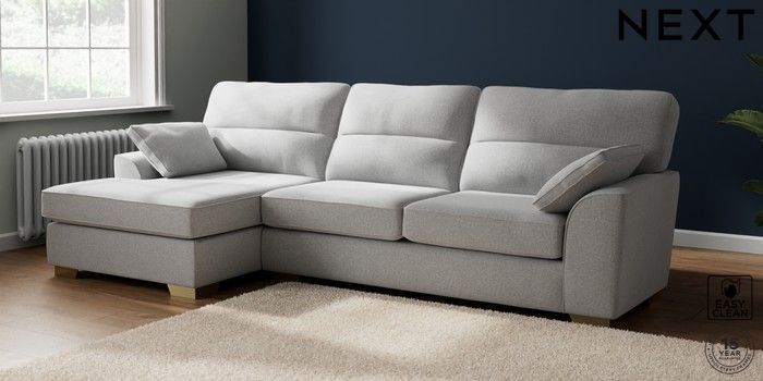 7.2.10 Stamford Highback Large Sofa Chaise - Left Hand Tweedy Blend Easy Clean Light Silver Grey Large Square Angle - Brushed Brass | Made Click here to use our website with more accessibility support, for example screen readers