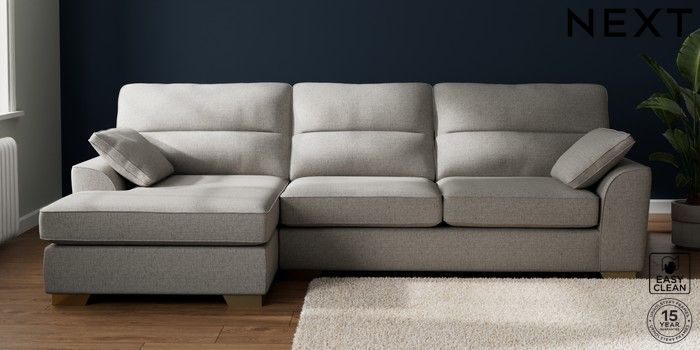 7.2.10 Stamford Highback Large Sofa Chaise - Left Hand Woven Chenille Easy Clean Light Grey Large Square Angle - Brushed Brass | Made Click here to use our website with more accessibility support, for example screen readers