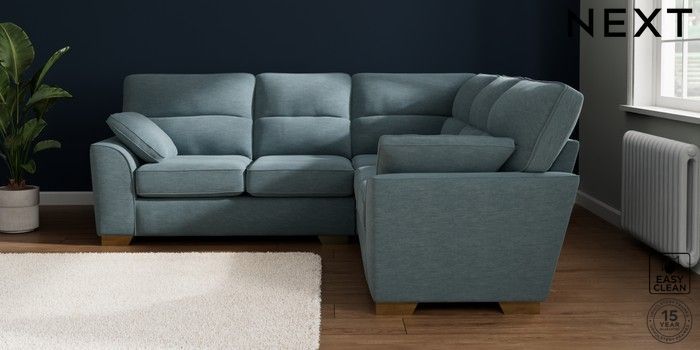 7.2.10 Stamford Highback Medium Corner Sofa - Universal Fine Chenille Easy Clean Mid Blue Large Square Angle - Brushed Brass | Made Click here to use our website with more accessibility support, for example screen readers