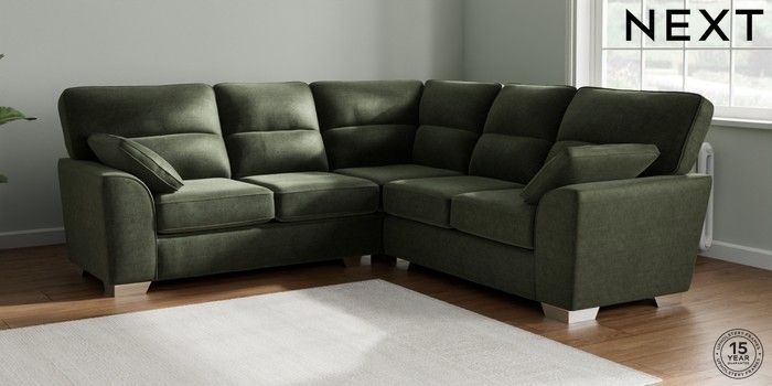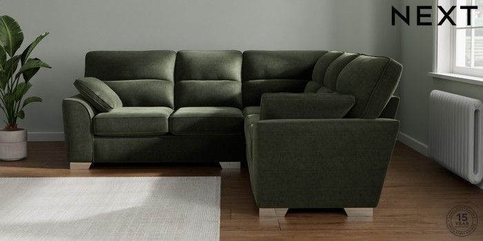 7.2.10 Stamford Highback Medium Corner Sofa - Universal Luxe Chenille Mid Green Large Square Angle - Chrome Metal | Made Click here to use our website with more accessibility support, for example screen readers