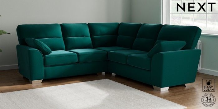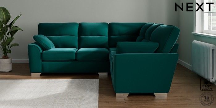 7.2.10 Stamford Highback Medium Corner Sofa - Universal Plush Velvet Easy Clean Juniper Green Large Square Angle - Chrome Metal | Made Click here to use our website with more accessibility support, for example screen readers