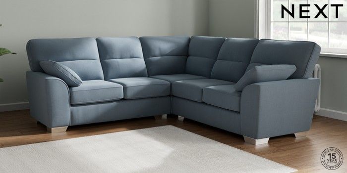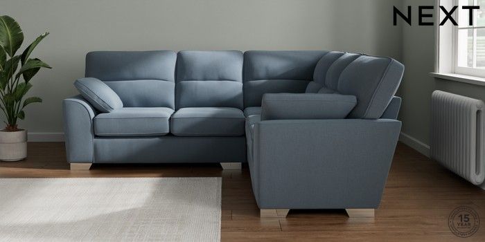 7.2.10 Stamford Highback Medium Corner Sofa - Universal Relaxed Linen Look Mid Blue Large Square Angle - Chrome Metal | Made Click here to use our website with more accessibility support, for example screen readers