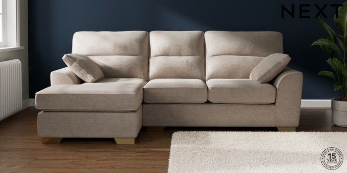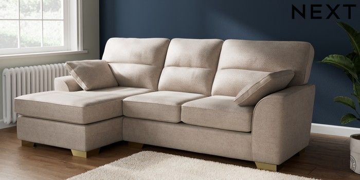 7.2.10 Stamford Highback Medium Sofa Chaise - Left Hand Boucle Chenille Light Natural Large Square Angle - Brushed Brass | Made Click here to use our website with more accessibility support, for example screen readers