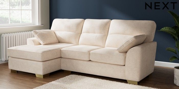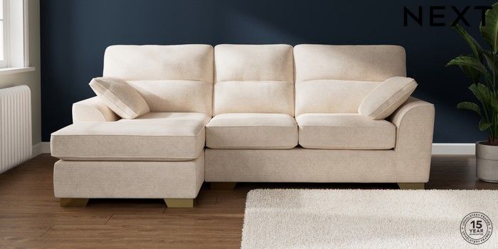 7.2.10 Stamford Highback Medium Sofa Chaise - Left Hand Boucle Chenille Oyster Large Square Angle - Brushed Brass | Made Click here to use our website with more accessibility support, for example screen readers