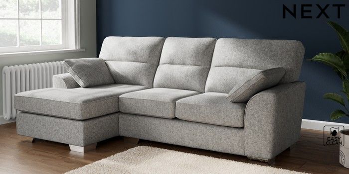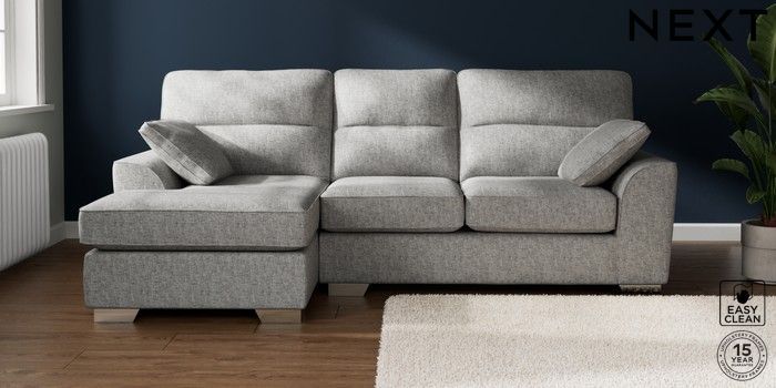7.2.10 Stamford Highback Medium Sofa Chaise - Left Hand Chunky Boucle Easy Clean Light Grey Large Square Angle - Chrome Metal | Made Click here to use our website with more accessibility support, for example screen readers
