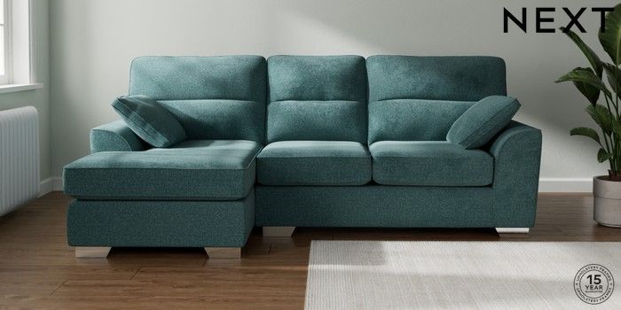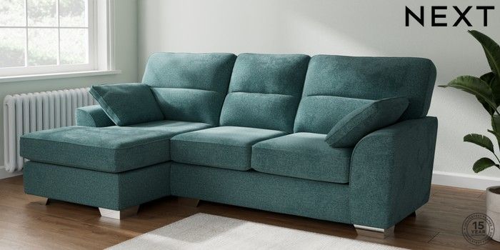 7.2.10 Stamford Highback Medium Sofa Chaise - Left Hand Chunky Chenille Mid Teal Green Large Square Angle - Chrome Metal | Made Click here to use our website with more accessibility support, for example screen readers