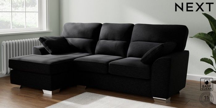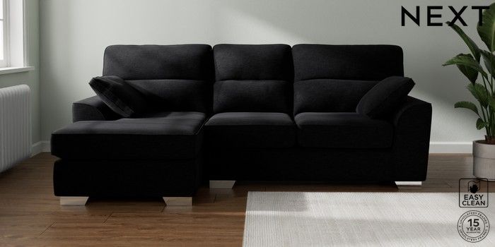 7.2.10 Stamford Highback Medium Sofa Chaise - Left Hand Fine Chenille Easy Clean Black Large Square Angle - Chrome Metal | Made Click here to use our website with more accessibility support, for example screen readers
