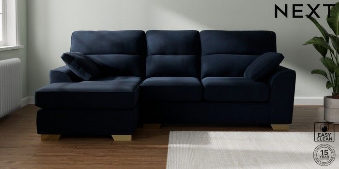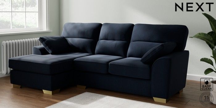 7.2.10 Stamford Highback Medium Sofa Chaise - Left Hand Fine Chenille Easy Clean Dark Navy Blue Large Square Angle - Brushed Brass | Made Click here to use our website with more accessibility support, for example screen readers